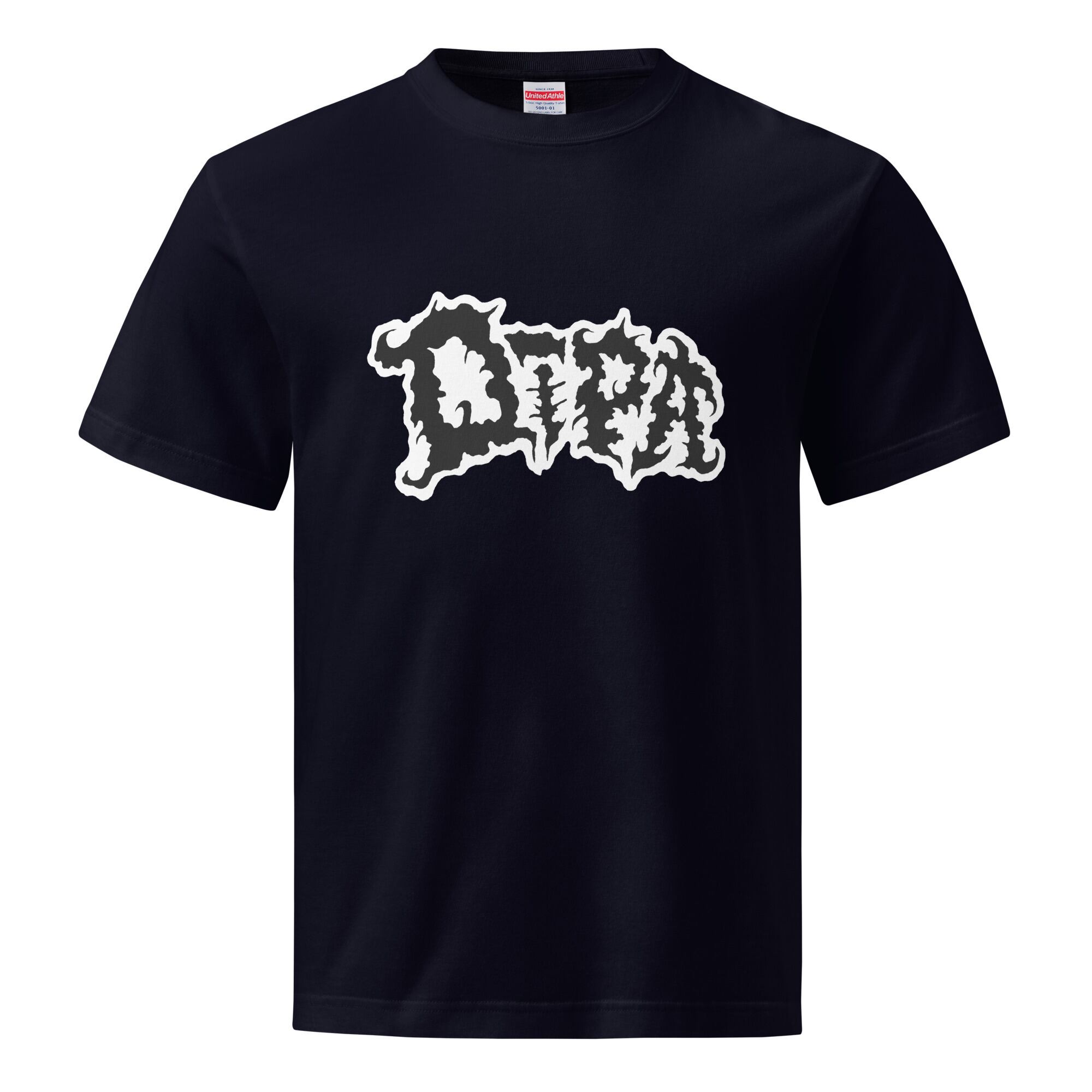 黒ボディに前面にロゴが大きくプリントされたTシャツです。